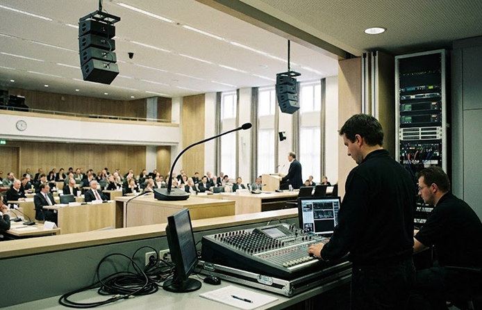 The audio mixer from the meeting room is connected to a tablet or laptop which is used to log into the AI translation and captioning system. This helps ensure the AI system receives high quality sound input.