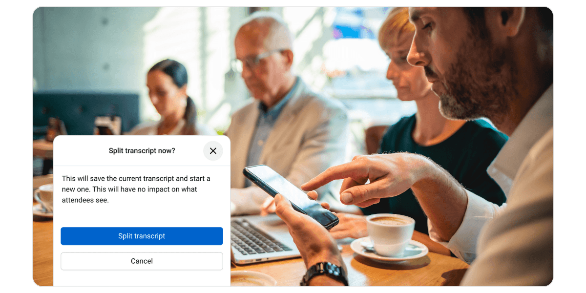Marque os momentos que importam. Agora, os apresentadores podem dividir as transcrições ao vivo durante sessões consecutivas, para que a transcrição e o resumo de cada reunião sejam publicados como ativos individuais. Cada sessão gera automaticamente legendas, transcrições e resumos precisos em dezenas de idiomas, prontos para serem reutilizados para o que vier a seguir.